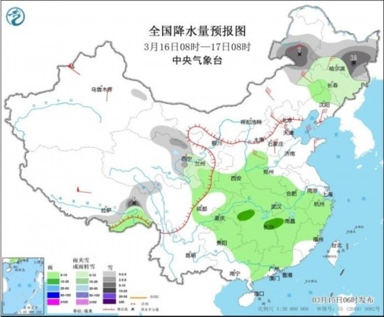 3月15日08時(shí)至16日08時(shí),新疆北部、青海北部、甘肅、內(nèi)蒙古東部、黑龍江北部、河北西北部等地部分地區(qū)有小到中雪或雨夾雪,其中,新疆沿天山地區(qū)、青海東北部、黑龍江東北部等地部分地區(qū)有大雪(5~8毫米)。甘肅南部、寧夏南部、陜西西南部、湖北南部、湖南、江西大部、重慶東部、貴州大部、華南大部等地部分地區(qū)有小到中雨,其中,湖南東北部、江西中部、廣西東北部等地部分地區(qū)有大雨(25~35毫米)。新疆北部、青海東部、甘肅、內(nèi)蒙古大部、黑龍江東部、吉林東部等地部分地區(qū)有4~6級(jí)風(fēng),其中,新疆伊犁河谷和沿天山地區(qū)等地有8~9級(jí)風(fēng),山口風(fēng)力可達(dá)10~11級(jí)。新疆東部和南部、內(nèi)蒙古西部、青海西北部、甘肅中西部、寧夏、陜西北部等地的部分地區(qū)有揚(yáng)沙或浮塵天氣,內(nèi)蒙古西部、甘肅中部局地有沙塵暴。
