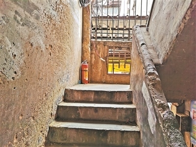 樓梯狹窄,部分墻面呈土黃色且坑坑洼洼。