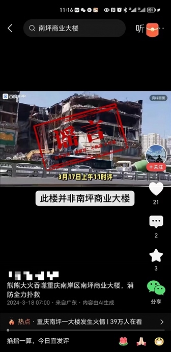 央視網(wǎng)消息:據(jù)“網(wǎng)信南岸”微信公眾號消息,3月18日,網(wǎng)傳消息稱“重慶南坪商業(yè)大樓突發(fā)大火,傷亡慘重”,有網(wǎng)友還發(fā)布了經(jīng)AI生成且圖文嚴(yán)重不符的視頻。經(jīng)核實(shí),17日11時16分,南坪商業(yè)大廈住宅著火,區(qū)消防救援支隊(duì)和南坪街道及時到場處置,11時35分,現(xiàn)場明火熄滅,無人員傷亡,未發(fā)生次生事故。南岸辟謠提醒您,不造謠、不信謠、不傳謠!