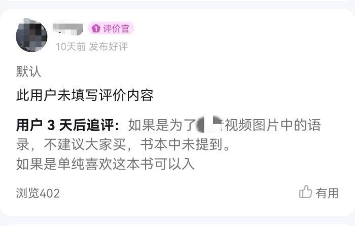 例如,在余華《我們生活在巨大的差距里》這本書的購(gòu)買評(píng)論里,有人就提到,“如果是為了視頻圖片中的語(yǔ)錄,不建議大家購(gòu)買,書本中未提到。”