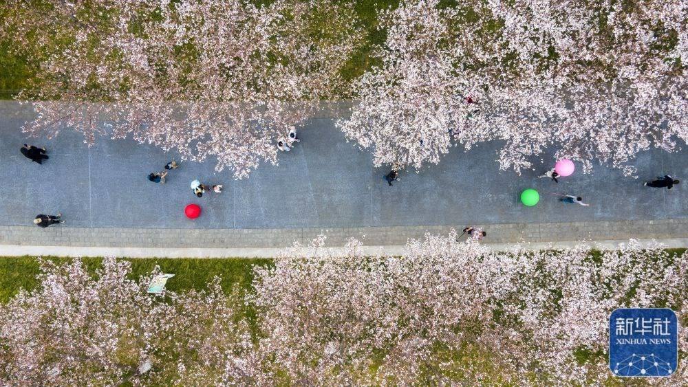 3月23日,游人在浙江省金華市國際友城公園櫻花大道上賞景游玩(無人機照片)。新華社發(fā)(胡肖飛攝)