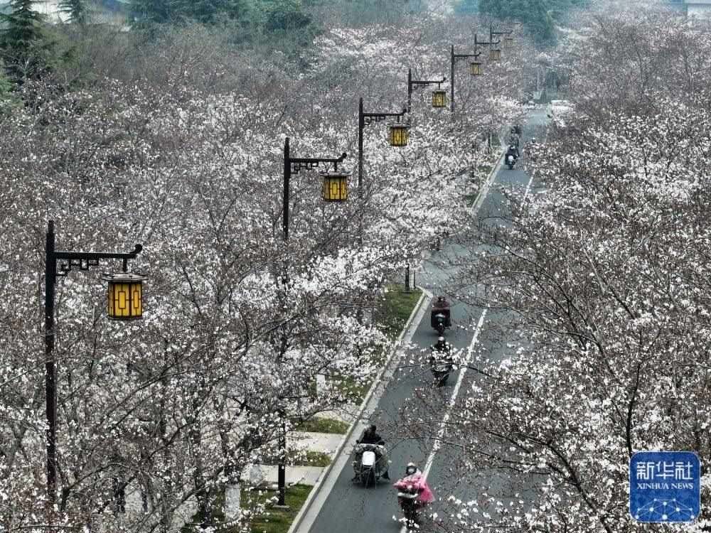 3月23日拍攝的江蘇省揚州市鑒真路的“櫻花大道”景色(無人機照片)。新華社發(fā)(孟德龍攝)