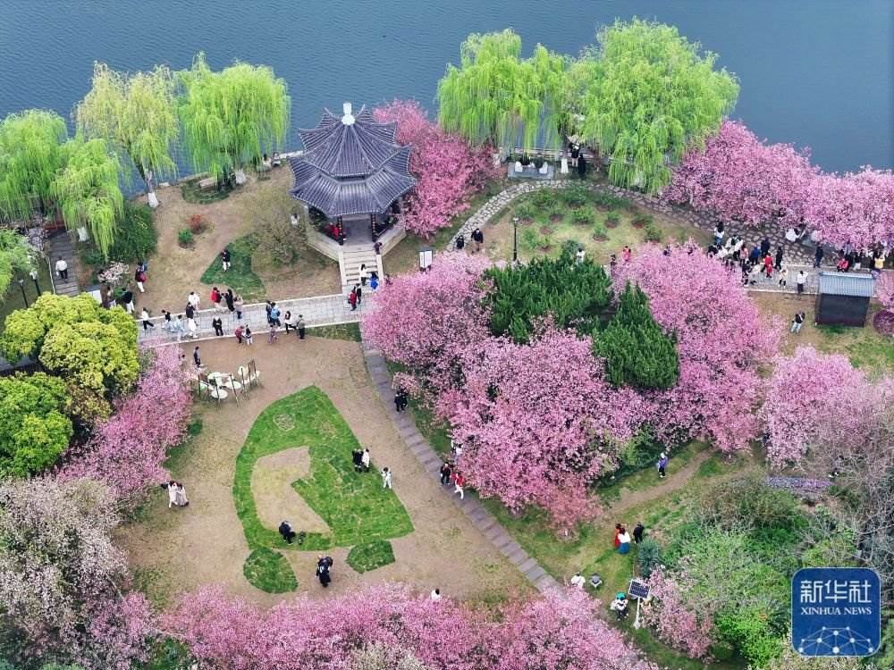 3月23日,游客在南京莫愁湖公園內(nèi)賞花游玩(無人機照片)。新華社發(fā)(楊素平攝)