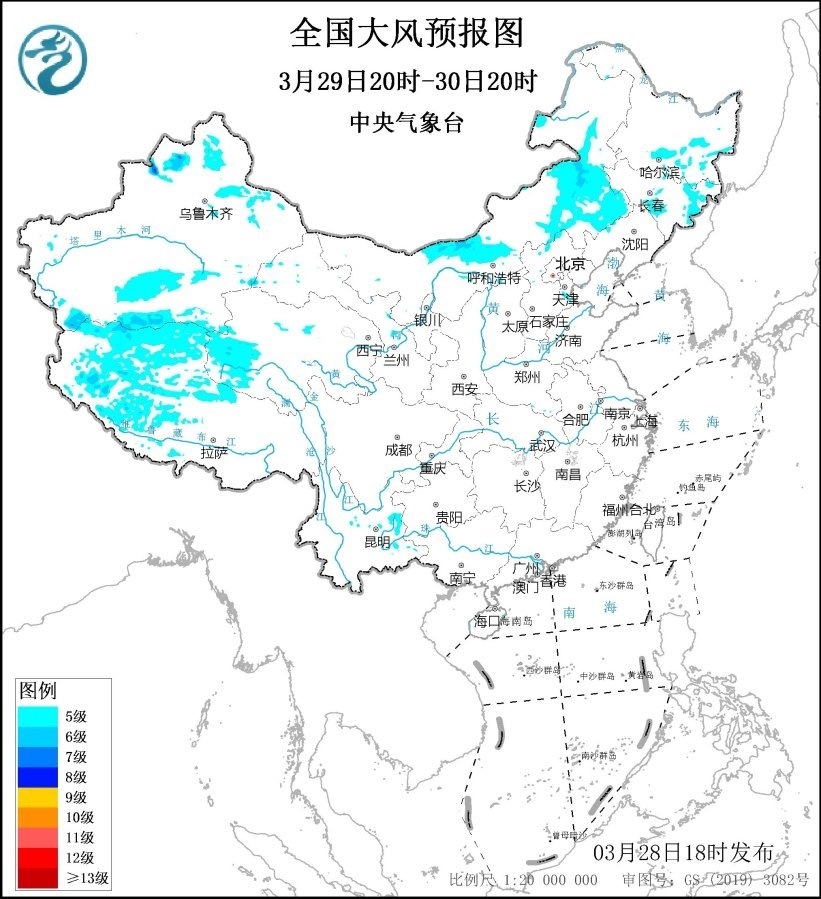 預(yù)計(jì),3月28日20時(shí)至29日20時(shí),內(nèi)蒙古大部、吉林西部、遼寧南部、甘肅東部、寧夏北部等地有5~6級(jí)、陣風(fēng)7~9級(jí)風(fēng);黃海中部和南部海域、東海東北部海域?qū)⒂?~8級(jí)、陣風(fēng)9級(jí)風(fēng),其中東海東北部的部分海域風(fēng)力可達(dá)9級(jí)、陣風(fēng)10級(jí)。