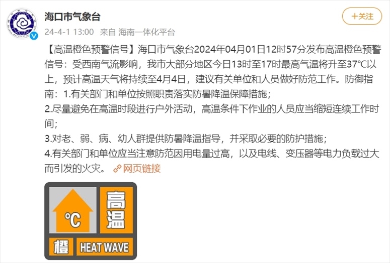 央視網(wǎng)消息:據(jù)@??谑袣庀笈_ 微博消息,??谑袣庀笈_2024年04月01日12時57分發(fā)布高溫橙色預(yù)警信號:受西南氣流影響,??谑写蟛糠值貐^(qū)今日13時至17時最高氣溫將升至37℃以上,預(yù)計(jì)高溫天氣將持續(xù)至4月4日,建議有關(guān)單位和人員做好防范工作。