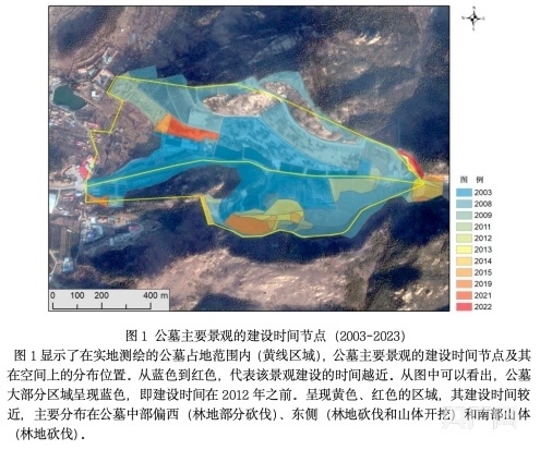 位于青島城陽區(qū)夏莊街道華陰社區(qū)太平山的太平陵公墓,地處嶗山山脈西麓,在嶗山風(fēng)景區(qū)保護范圍內(nèi)。該公墓是1996年經(jīng)民政部門審批的經(jīng)營性公墓,合法審批面積為87.53畝。遙感衛(wèi)星影像分析顯示,該公墓大面積非法擴建已持續(xù)多年,存在毀林挖山建墓地的情況。
