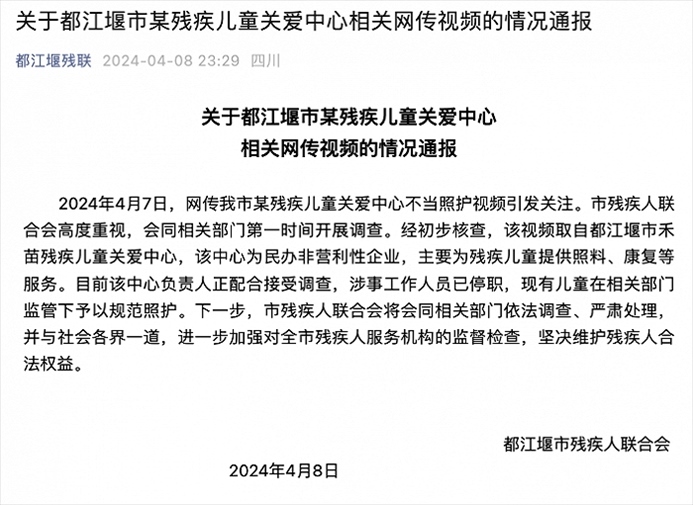 央視網(wǎng)消息:都江堰殘聯(lián)4月8日通報,4月7日,網(wǎng)傳都江堰市某殘疾兒童關(guān)愛中心不當(dāng)照護(hù)視頻引發(fā)關(guān)注。市殘疾人聯(lián)合會高度重視,會同相關(guān)部門第一時間開展調(diào)查。經(jīng)初步核查,該視頻取自都江堰市禾苗殘疾兒童關(guān)愛中心,該中心為民辦非營利性企業(yè),主要為殘疾兒童提供照料、康復(fù)等服務(wù)。目前該中心負(fù)責(zé)人正配合接受調(diào)查,涉事工作人員已停職,現(xiàn)有兒童在相關(guān)部門監(jiān)管下予以規(guī)范照護(hù)。下一步,市殘疾人聯(lián)合會將會同相關(guān)部門依法調(diào)查、嚴(yán)肅處理,并與社會各界一道,進(jìn)一步加強(qiáng)對全市殘疾人服務(wù)機(jī)構(gòu)的監(jiān)督檢查,堅決維護(hù)殘疾人合法權(quán)益。?