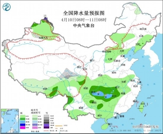 4月10日08時(shí)至11日08時(shí),新疆北疆北部、黑龍江西北部、西藏中部和北部、青海東南部、川西高原北部等地部分地區(qū)有小到中雪或雨夾雪,其中,新疆北疆北部高海拔地區(qū)有大到暴雪,局地大暴雪(20~25毫米)。內(nèi)蒙古東部、華北北部、東北地區(qū)東部、新疆北部、西藏東部、四川盆地大部、重慶、江淮西部、江漢、江南北部和西部、貴州大部、廣西大部、云南西部和南部、海南島、臺(tái)灣島等地部分地區(qū)有小到中雨,其中,重慶東南部、貴州北部、湖南中西部等地部分地區(qū)有大雨(25~40毫米)。新疆東部部分地區(qū)有6~7級(jí)風(fēng)。
