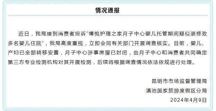 央視網(wǎng)消息:據(jù)“滇池度假發(fā)布”官微消息,昆明市市場(chǎng)監(jiān)督管理局滇池國(guó)家旅游度假區(qū)分局通報(bào),近日,該局接到消費(fèi)者投訴“博悅護(hù)理之家月子中心嬰兒托管期間疑似裝修致多名嬰兒住院”,該局高度重視,立即會(huì)同有關(guān)部門(mén)開(kāi)展調(diào)查核實(shí)。目前,嬰兒、產(chǎn)婦已全部轉(zhuǎn)移安置,月子中心涉事房屋已封閉,由月子中心和消費(fèi)者共同確定第三方專(zhuān)業(yè)檢測(cè)機(jī)構(gòu)對(duì)其開(kāi)展檢測(cè),后續(xù)將根據(jù)調(diào)查情況依法依規(guī)進(jìn)行處理。