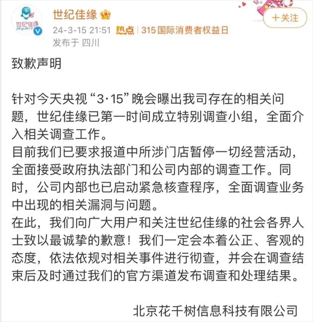 值得一提的是,今年央視3·15晚會曝光珍愛網(wǎng)、世紀(jì)佳緣、戀愛課等多家婚戀平臺涉嫌用優(yōu)質(zhì)的異性資源、0門檻的誘人廣告、言之鑿鑿的成功案例作為噱頭,欺騙消費(fèi)者。對此,世紀(jì)佳緣致歉稱,第一時間成立特別調(diào)查小組,全面介入相關(guān)調(diào)查工作。目前公司已要求報(bào)道中所涉門店暫停一切經(jīng)營活動,全面接受政府執(zhí)法部門和公司內(nèi)部的調(diào)查工作。同時,公司內(nèi)部也已啟動緊急核查程序,全面調(diào)查業(yè)務(wù)中出現(xiàn)的相關(guān)漏洞與問題。珍愛網(wǎng)官方微博發(fā)布致歉聲明,稱在第一時間成立專項(xiàng)小組,采取最嚴(yán)措施,全面深入調(diào)查并立即處理相關(guān)問題。