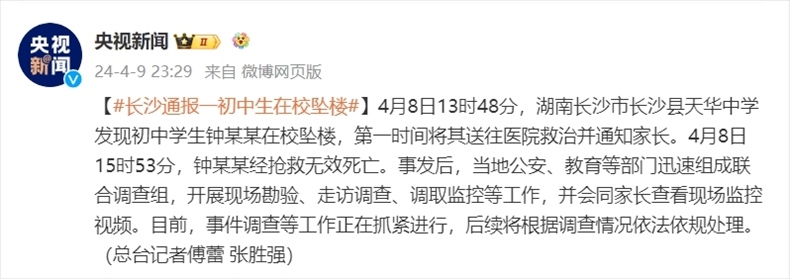 ·湖南長沙縣通報初中生在校墜亡:將根據(jù)調(diào)查情況依法依規(guī)處理。