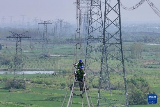 4月9日,在位于安徽省合肥市廬江縣郭河鎮(zhèn)的直流±800千伏建蘇線3418號(hào)桿塔處,國(guó)網(wǎng)合肥供電公司工人進(jìn)行高空檢修作業(yè)(無(wú)人機(jī)照片)。