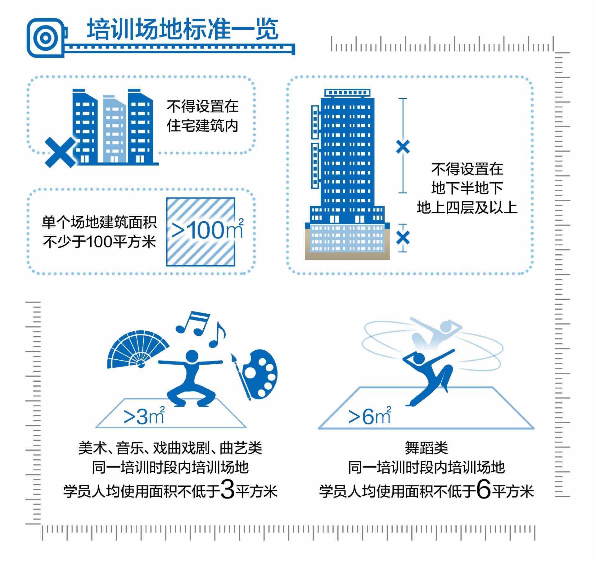 具體到店面內(nèi)部硬件,《標準》明確,開展培訓教學的單個場地建筑面積應(yīng)不少于100平方米,美術(shù)、音樂、戲曲戲劇、曲藝類同一培訓時段內(nèi)培訓場地學員人均使用面積不低于3平方米,舞蹈類同一培訓時段內(nèi)培訓場地學員人均使用面積不低于6平方米,確保不擁擠、易疏散。