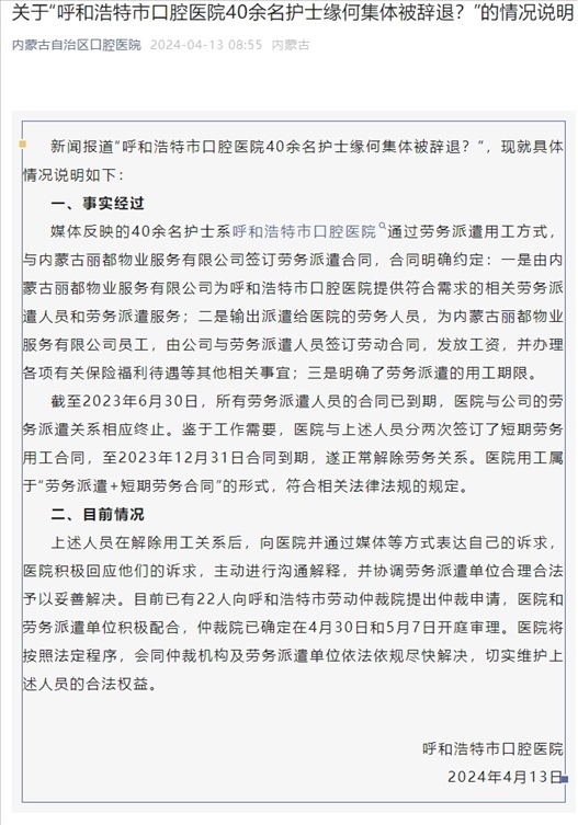 新聞報道“呼和浩特市口腔醫(yī)院40余名護士緣何集體被辭退?”,現(xiàn)就具體情況說明如下: