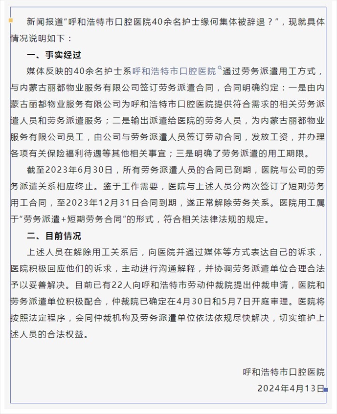 ·40余名護士無故被辭退?呼和浩特市口腔醫(yī)院發(fā)布情況說明。