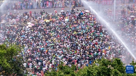 4月12日,云南省德宏傣族景頗族自治州2024年潑水狂歡節(jié)在芒市開幕,上萬名當?shù)馗髯迦罕娕c遠道而來的游客歡聚芒市廣場,互相潑水祝福。