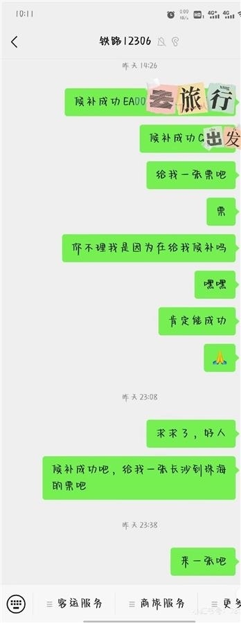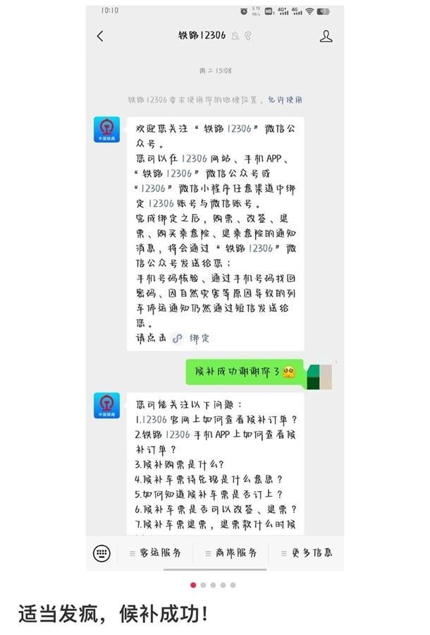“你不理我是因為在給我候補嗎”“親愛的我要票”……另一名網(wǎng)友也發(fā)帖稱,自己使用向12306微信公眾號“發(fā)瘋”的辦法,成功候補到了車票,其發(fā)布的網(wǎng)帖題為“適當發(fā)瘋候補成功”。