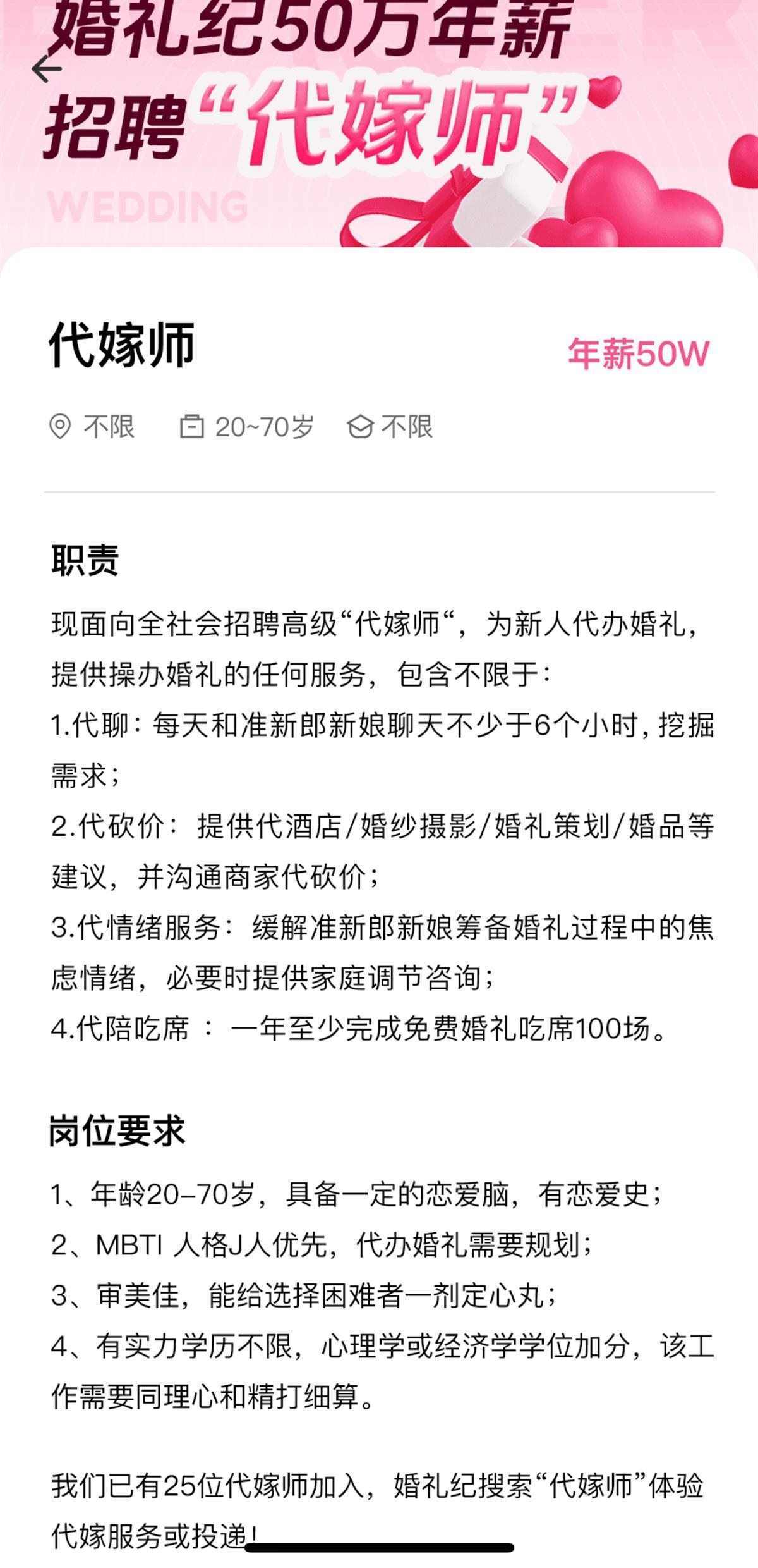 點(diǎn)擊該頁面下方的“成為代嫁師”按鈕,便進(jìn)入了網(wǎng)上流傳的關(guān)于代嫁師的崗位介紹:“代嫁師”的工作內(nèi)容包含但不限于代聊、代砍價(jià)、代情緒服務(wù)、代陪吃席等,其中代聊服務(wù)要求“每天和準(zhǔn)新郎新娘聊天不少于6個小時”,代陪吃席要求“一年至少完成免費(fèi)婚禮吃席100場”。崗位要求:1、年齡20-70歲,具備一定戀愛腦,有戀愛史;2、MBTI人格J人優(yōu)先,代辦婚禮需要規(guī)劃;3、審美佳,能給選擇困難者一劑定心丸;4、有實(shí)力學(xué)歷不限,心理學(xué)或經(jīng)濟(jì)學(xué)學(xué)位加分,該工作需要同理心和精打細(xì)算。