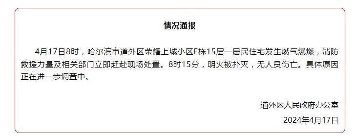 央視網(wǎng)消息:據(jù)“記憶道外”官微消息,哈爾濱市道外區(qū)人民政府辦公室發(fā)布情況通報,4月17日8時,哈爾濱市道外區(qū)榮耀上城小區(qū)F棟15層一居民住宅發(fā)生燃氣爆燃,消防救援力量及相關部門立即趕赴現(xiàn)場處置。8時15分,明火被撲滅,無人員傷亡。具體原因正在進一步調(diào)查中。