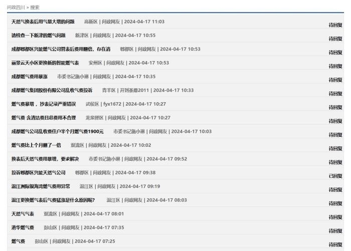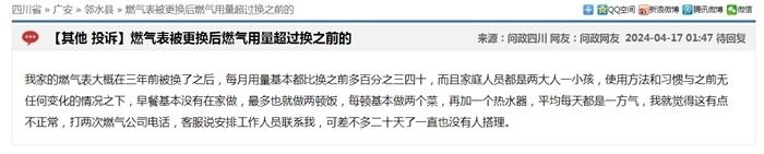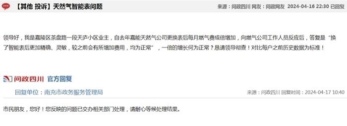 中新網(wǎng)4月17日電(中新財(cái)經(jīng)記者 吳濤)近日,在“問政四川”平臺(tái)上,不少網(wǎng)友反映“更換新表后燃?xì)赓M(fèi)異常上漲”,這些留言顯示來自四川成都、自貢、廣安、南充等多地,僅僅在4月16日,保守估計(jì)就有十幾條;17日上午又出現(xiàn)十幾條。大部分尚未得到回復(fù),部分獲得官方回復(fù)稱“留言已轉(zhuǎn)交給相關(guān)機(jī)構(gòu)進(jìn)行處理”。