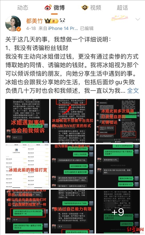 微博上,都美竹把上述朱姐說過的“無需你償還”“心甘情愿”、愿意供都美竹上大學(xué)的聊天截圖放在一起,表示朱姐“此前多次強調(diào),打賞是自愿的,無需償還”。