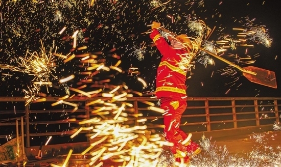 夜幕下,絢麗鐵花在清湖古鎮(zhèn)的老鐵路橋上綻放。