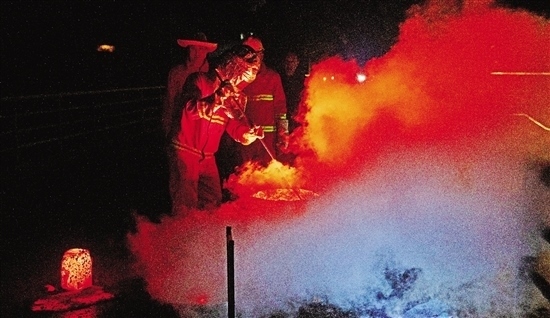 表演結束,取出上千攝氏度的坩堝準備滅火。