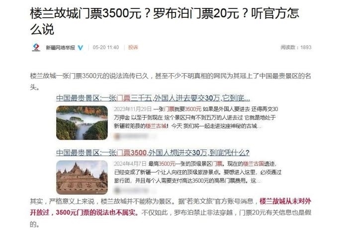 文章稱, ?樓蘭故城一張門票3500元的說法流傳已久,甚至不少不明真相的網(wǎng)民為其冠上了中國最貴景區(qū)的名頭。其實,嚴格意義上來說,樓蘭故城并不能稱為景區(qū)。據(jù)“若羌文旅”官方賬號消息,樓蘭故城從未對外開放過,3500元門票的說法也不屬實。不僅如此,羅布泊禁止非法穿越,門票20元有關信息也是假的。