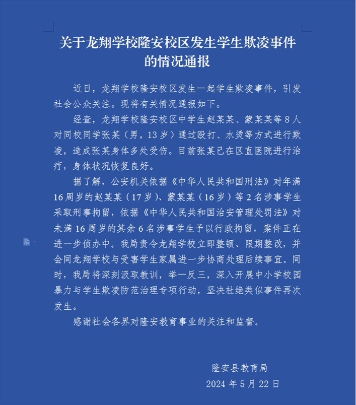 ·廣西隆安通報學生遭毆打水燙欺凌:2學生刑拘、6學生行政拘留。