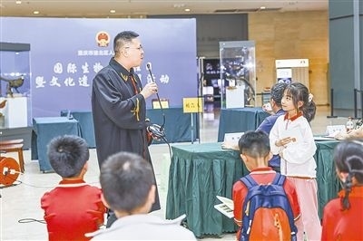 圖①:法官在珍品庫房為小學(xué)生講解野生動物保護(hù)法律知識。