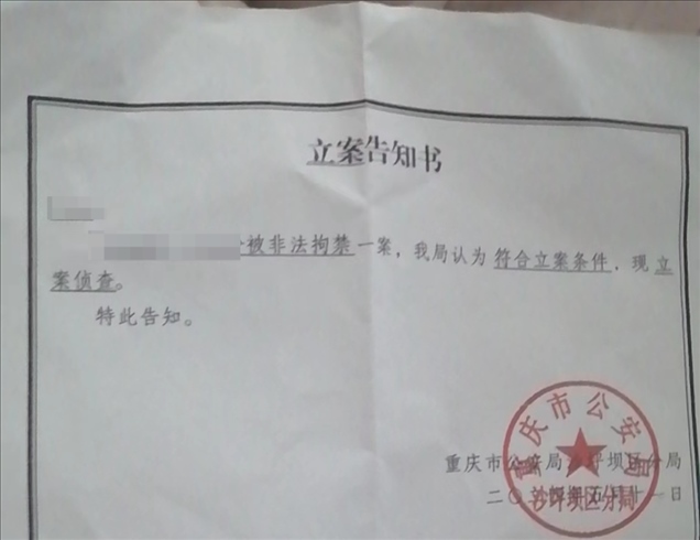 事發(fā)后,家屬向當(dāng)?shù)嘏沙鏊鶊蟀浮M跸壬鍪镜牧父嬷獣@示,5月11日,重慶市公安局沙坪壩區(qū)分局對前文中的夫妻倆被非法拘禁一案立案偵查。