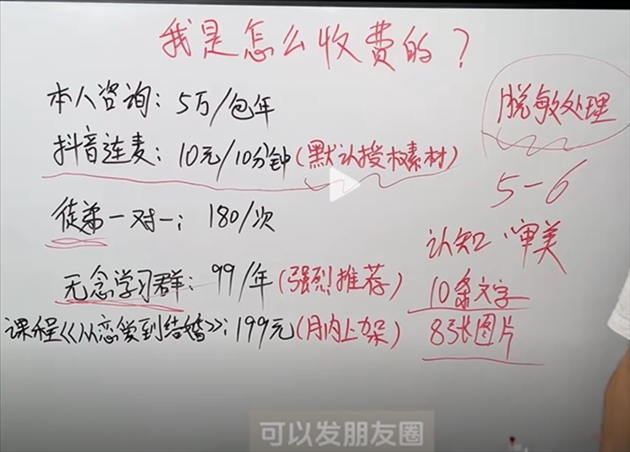 此外,不少婚戀軍師都公開了聯(lián)系方式,通過提供一對一指導、付費視頻、情感課程、收徒、經營朋友圈教學等形式斂金,且價格不菲。