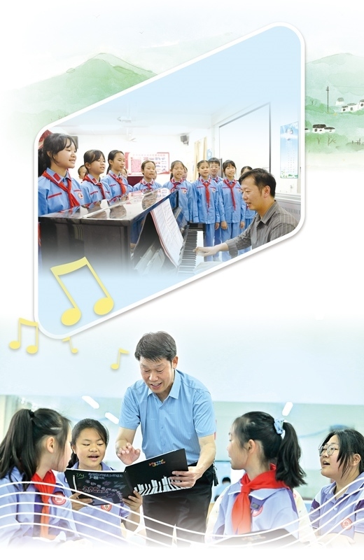 上圖:江西興國縣蕭華紅軍小學(xué)小紅星合唱團(tuán)正在練習(xí)。李 玲攝 下圖:湖北宣恩縣博雅實驗學(xué)校土家娃合唱團(tuán)負(fù)責(zé)人廖光新在指導(dǎo)學(xué)生。陳緒開攝