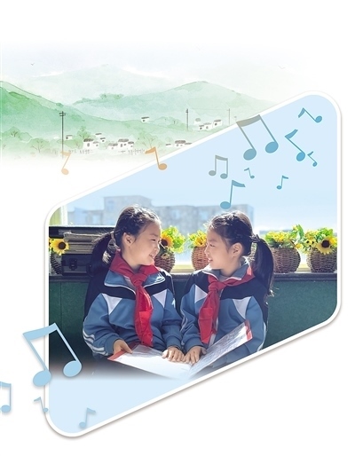 講臺上,隨著廖光新的雙手向前一打開,學(xué)生們齊刷刷地唱了起來?!敖裉焯鞖夂?,去找嘎嘎(外婆)嘍……”稚嫩而清脆的聲音瞬間充滿整個教室,透過窗戶傳向遠(yuǎn)處的大山。