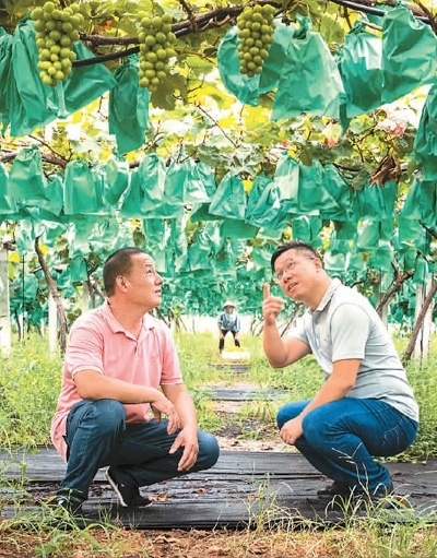 陳李波(右)在崇賢村葡萄種植園與農(nóng)戶一起察看葡萄長勢。錢麗君攝