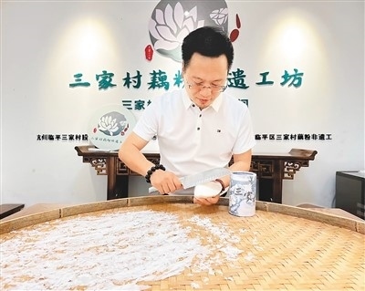 吳景順在三家村藕粉非遺工坊體驗手削藕粉傳統(tǒng)技藝。袁 昕攝