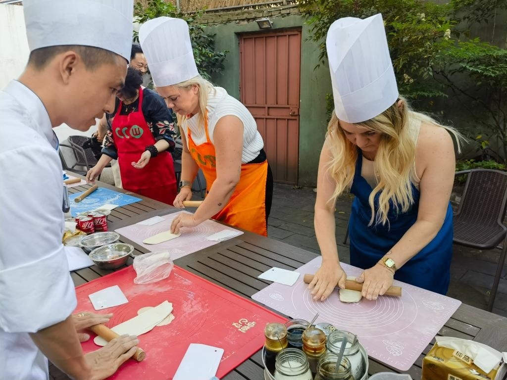 5月29日,入境游客在中國專業(yè)廚師的指導下?lián){面。新華社記者 陳愛平 攝