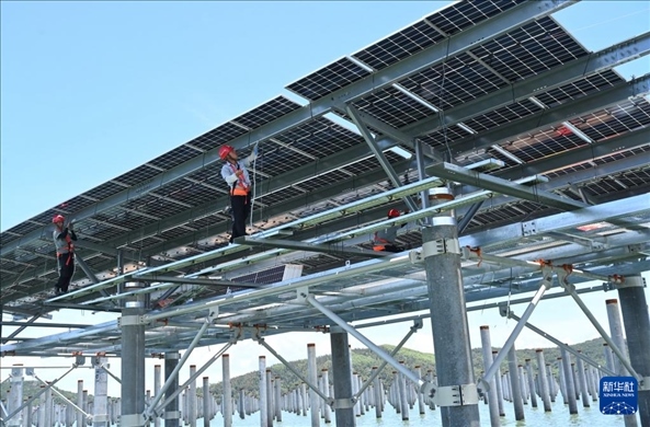 6月20日,施工人員在海上光伏電站現(xiàn)場(chǎng)安裝支架和光伏組件。