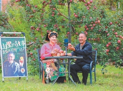 四川省小金縣沃日鎮(zhèn)木欄村,電商主播同果農(nóng)一起直播賣蘋果。嚴(yán)易程攝(人民視覺(jué))