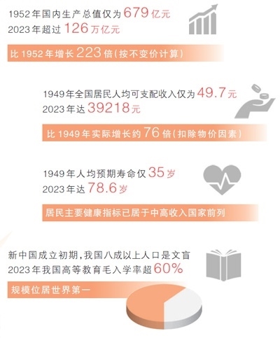 各行各業(yè)的發(fā)展成就,人民生活的蒸蒸日上,濃縮在一組組數(shù)據(jù)中。與新中國(guó)成立初期相比,2023年國(guó)內(nèi)生產(chǎn)總值增長(zhǎng)223倍、人均GDP增長(zhǎng)89倍、人均預(yù)期壽命提高43.6歲、農(nóng)村貧困人口全部脫貧……國(guó)家統(tǒng)計(jì)局近日發(fā)布新中國(guó)成立75年經(jīng)濟(jì)社會(huì)發(fā)展成就系列報(bào)告,“數(shù)”說(shuō)75年偉大成就,本版“大數(shù)據(jù)觀察”欄目推出特別報(bào)道,記錄同心同德、艱苦奮斗的奮進(jìn)歷程,匯聚共襄強(qiáng)國(guó)建設(shè)、民族復(fù)興偉業(yè)的磅礴力量。