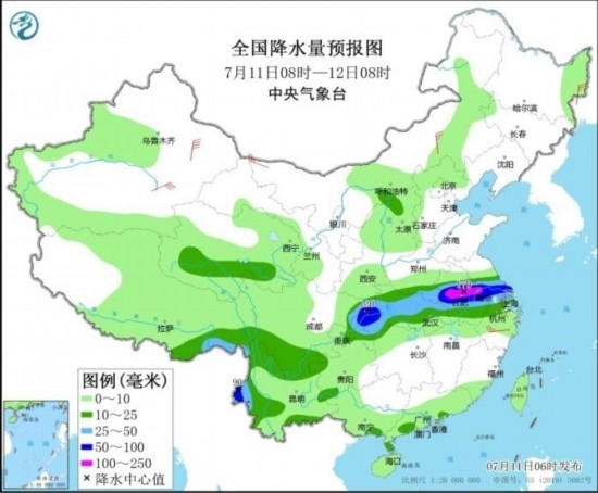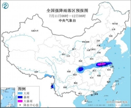 7月11日08時至12日08時,四川東北部、重慶中北部、湖北西部和北部、河南東南部、安徽中部、江蘇南部、上海以及西藏東南部、云南西部等地部分地區(qū)有大到暴雨,其中,安徽中部、江蘇西南部、重慶北部等地部分地區(qū)有大暴雨(100~170毫米)。內(nèi)蒙古東南部和西北部、黑龍江東部、新疆東部、浙江中北部等地部分地區(qū)有4~6級風,其中,新疆東部部分地區(qū)有6~7級風。