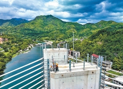 7月24日,中國鐵路上海局集團(tuán)有限公司寧波工務(wù)段防洪檢查小組的鐵路工人對杭溫高鐵楠溪江大橋主塔進(jìn)行巡檢。新華社記者 江 漢攝