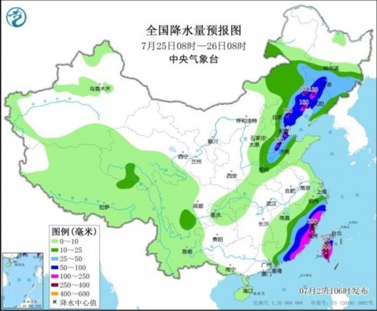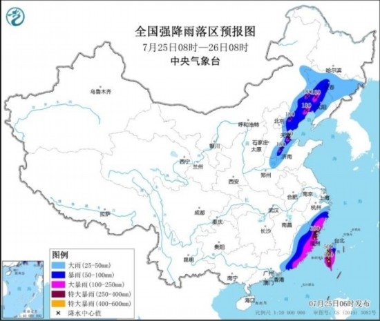 7月25日08時至26日08時,內(nèi)蒙古東部、吉林、遼寧、天津、河北東部、河南北部、山東北部、浙江南部、福建、廣東東部、臺灣島等地部分地區(qū)有大到暴雨,其中,內(nèi)蒙古東南部、遼寧中西部、河北東北部、山東北部、浙江南部、福建東部、廣東東南部、臺灣島大部等地部分地區(qū)有大暴雨,福建東北部、臺灣島中南部等地局地特大暴雨(250~500毫米)。