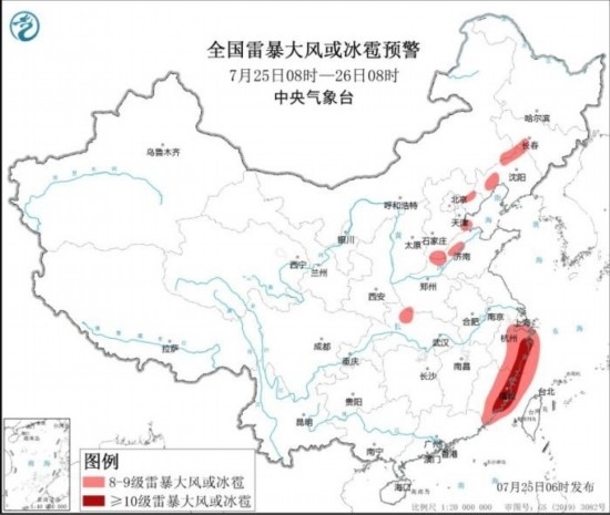 全國雷暴大風(fēng)或冰雹預(yù)警圖(7月25日08時-26日08時)