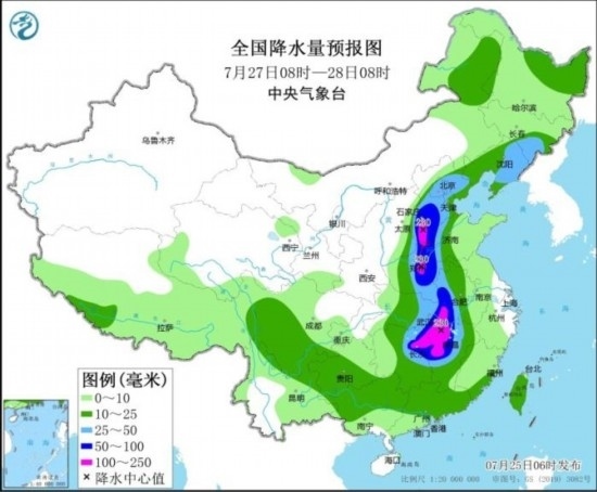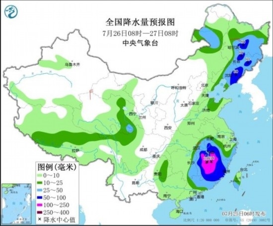 全國強(qiáng)降雨落區(qū)預(yù)報圖(7月25日08時-26日08時)