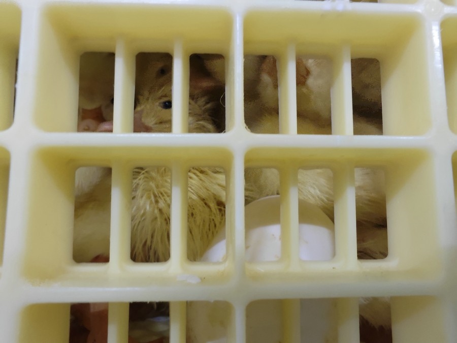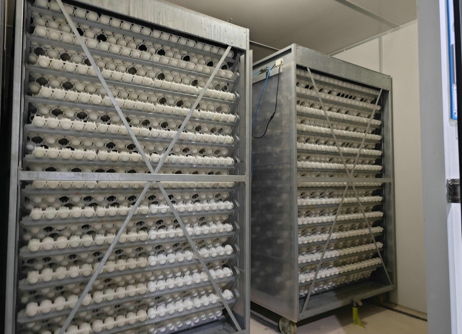 選蛋、稱重、儲(chǔ)蛋、洗蛋、孵化、落盤、出雛、出苗……經(jīng)過(guò)一系列程序,并經(jīng)過(guò)25天的孵化后,種蛋由孵化車轉(zhuǎn)移到出雛筐,在此等待3天,就完成了由蛋到苗的蛻變。