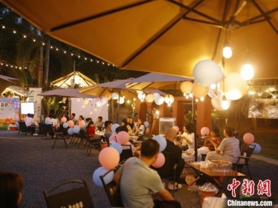 活動(dòng)現(xiàn)場(chǎng),搭建了露營(yíng)帳篷、休閑桌椅一字排開(kāi),布置了彩色氣球,提供甜品、水果、飲料等,燈光閃爍、晚風(fēng)習(xí)習(xí),氛圍甜蜜而浪漫。