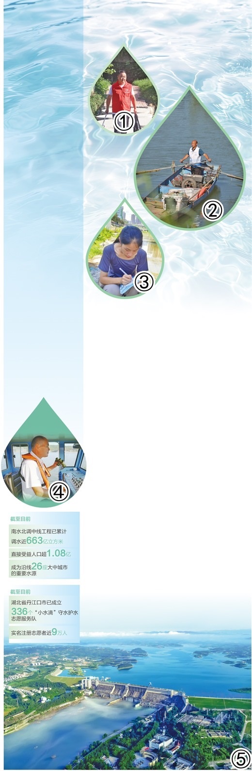 圖①:涂青海在巡線時(shí)撿拾垃圾。段 浩攝 圖②:蔣德新在巡護(hù)。丹江口市委宣傳部供圖 圖③:廖思盈在記錄水質(zhì)采樣數(shù)據(jù)。漢江師范學(xué)院供圖 圖④:肖安山在駕駛清漂船。鄖陽(yáng)區(qū)委宣傳部供圖 圖⑤:丹江口水庫(kù)鳥(niǎo)瞰。丹江口市委宣傳部供圖 數(shù)據(jù)來(lái)源:中國(guó)南水北調(diào)集團(tuán)有限公司、丹江口市委宣傳部