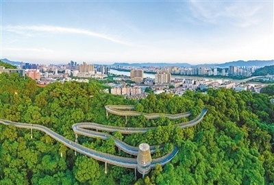 生態(tài)道福建福州市在建設(shè)“福道”時,采取鋼結(jié)構(gòu)高架、鏤空橋面棧道、節(jié)點(diǎn)大跨度橋梁等創(chuàng)新設(shè)計,最大限度保護(hù)森林原生態(tài)。林雙偉攝(人民視覺)