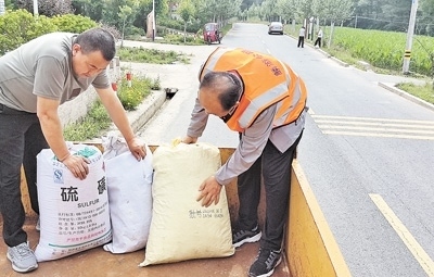 麟游縣農(nóng)村公路發(fā)展服務(wù)中心養(yǎng)護工(右)在幫助群眾裝糧食。楊雅芳攝